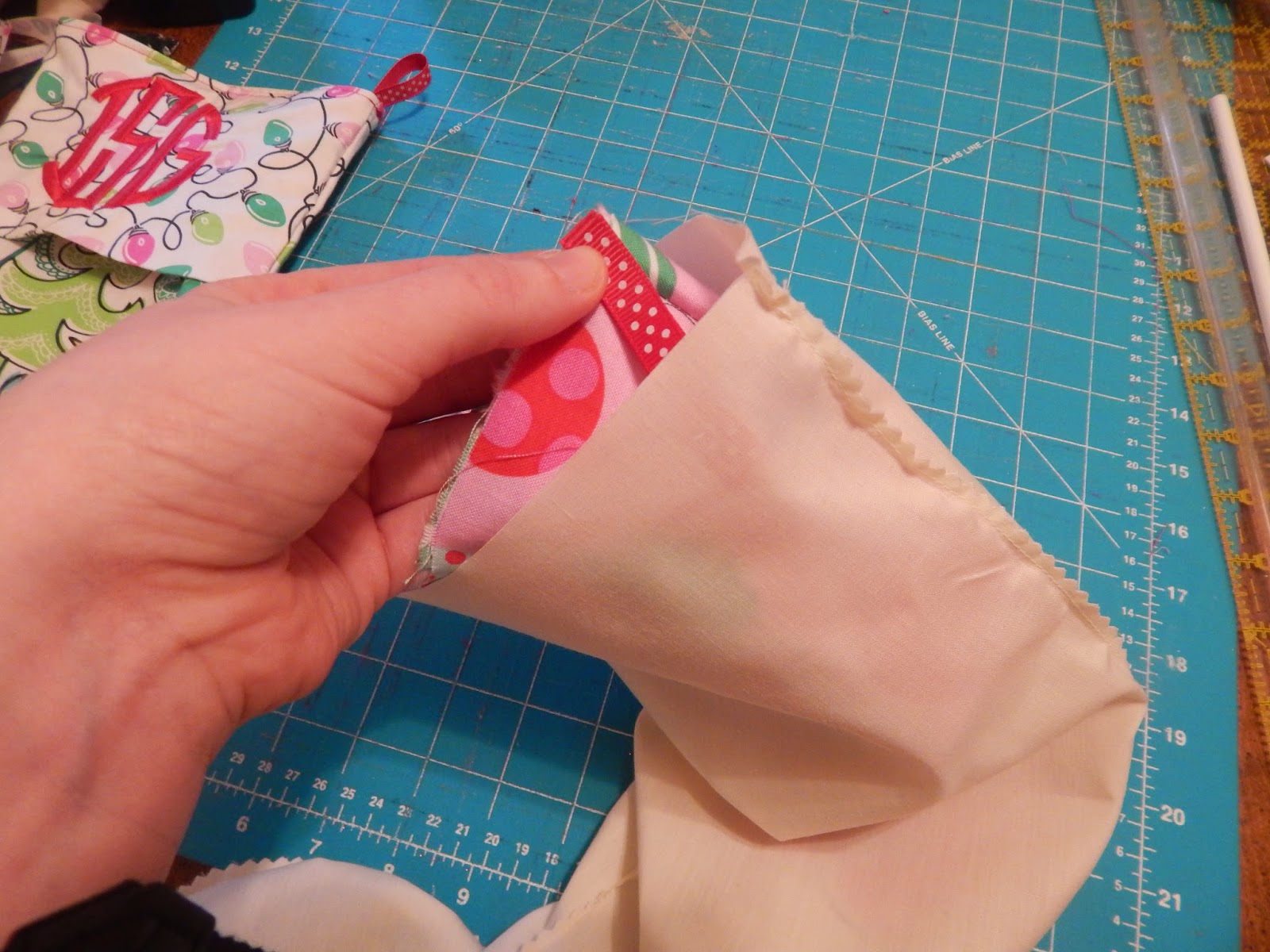 Turn your cuff piece right side out and press. Now slide your cuff piece onto your stocking the wrong side of your cuff will be facing the right side of your stocking and the raw edges of the stocking and cuff will be at the top. Now with your lining fabric wrong side out slide your stocking and cuff into the lining, all 3 of your raw edges will be at the top.